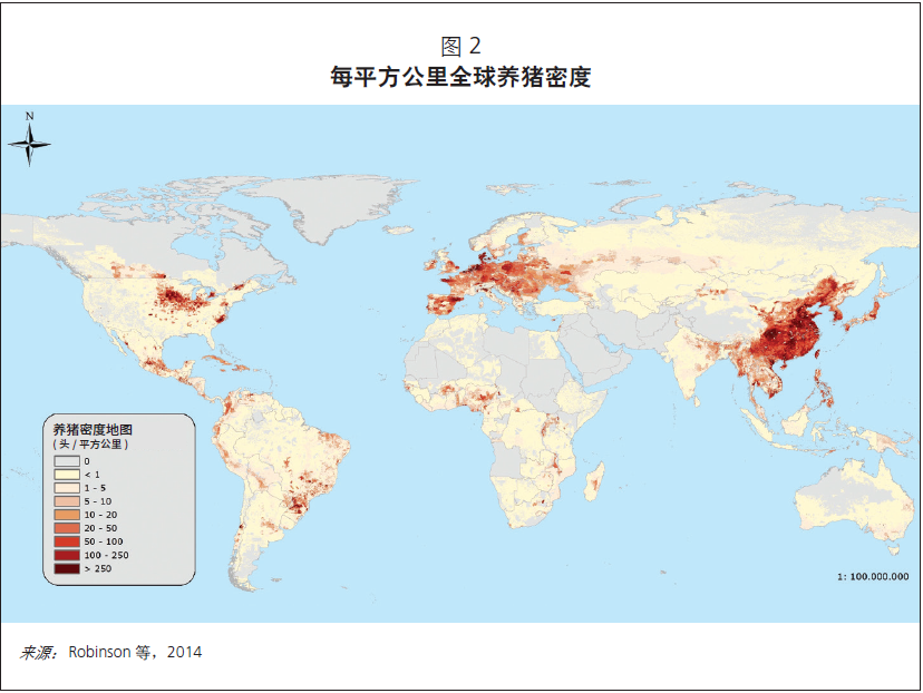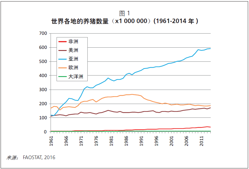 養豬行業在過去幾十年中穩步增長( 圖1),但全球增長不均衡。中國和東南亞的部分地區,如越南,西歐、美國中部和東部地區,中美洲和巴西南部,養豬數量眾多。在非洲,ASF 呈地方性流行,但豬的數量正在穩步增長,這反映出在飼養反芻動物為主的非洲,豬飼養率日益提高。豬的分布很大程度上受到宗教和文化因素的影響 – 在穆斯林國家很少或幾乎不養豬( 圖2)。