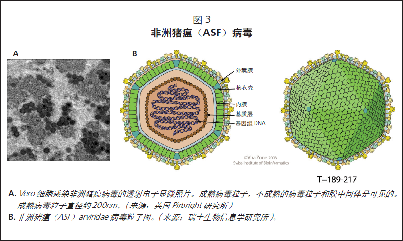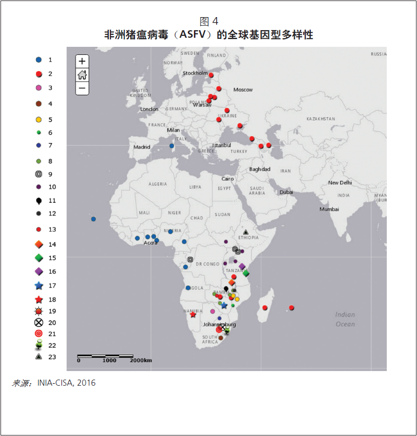 非洲豬瘟(ASF)的病原是單一的、有囊膜的、存在于細胞質內的雙鏈DNA 病毒,是非洲豬瘟病毒科的唯一成員( 圖3)。盡管通常認為只有一種ASF 病毒血清型,最近的研究報道,基于紅細胞吸附抑制試驗(HAI)可以將32 個ASFV 毒株分成8 個血清組, (Malogolovkin 等,2015)。然而,目前為止,通過對已知所有的ASF 病毒毒株進行遺傳特征分析,已經證實了23 個具有多個亞組的地理相關基因型,這說明了ASF 流行病學的復雜性( 圖4)。基因型是根據編碼VP-72 蛋白的單一基因序列確定的,蛋白質(VP-72) 中片段變異性的反映,主要用于系統發育和分子流行病學研究( 例如識別暴發的來源)。就目前所知,與毒力和其他病毒特性無關。