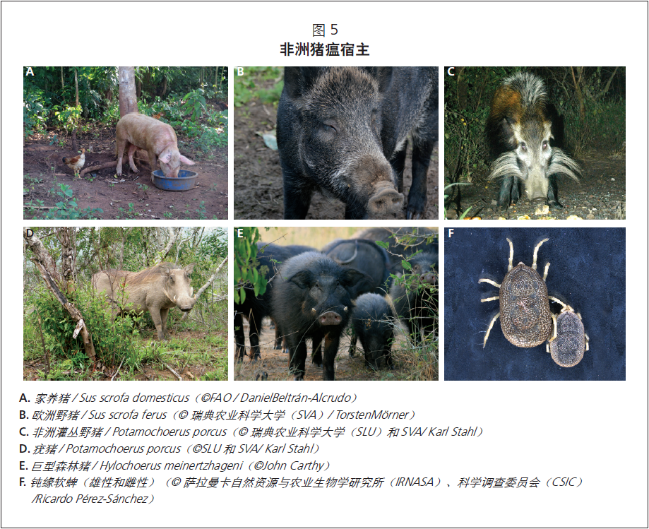 在自然的叢林傳播環節,軟體的、無眼的蜱蟲( 也稱為鈍緣蜱) 與非洲野生豬科動物都是ASFV 的天然儲存宿主。可以通過叮咬傳播病毒。豬科(Suidae) 的所有物種都易感,但僅對家養豬及野生家豬,以及它們的近親歐洲野豬致病。非洲野生豬科動物是ASF 的無癥狀攜帶者,并作為非洲部分地區的病毒儲主( 圖5)。包括疣豬( 非洲疣豬Phacochoerus africanus 和荒漠疣豬Phacochoerus aethiopicus)、非洲灌叢野豬( 非洲野豬Potamochoerus porcus) 和假面野豬(Potamochoerus larvatus) 和巨型森林豬( 巨林豬Hylochoerus meinertzhageni)。