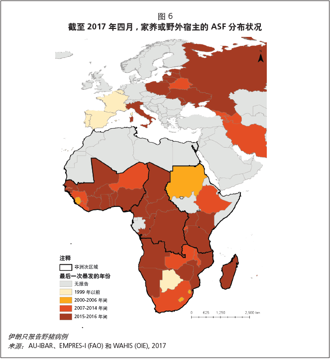 2007 年,ASF 進入格魯吉亞。病原屬于起源于非洲東南部的基因型II 型,且很有可能是通過廢棄食物作為泔水,或做垃圾處理被豬采食。該疫病在高加索地區迅速蔓延(2007 年亞美尼亞和2008 年阿塞拜疆),并進入俄羅斯聯邦(2007年)。在過去的幾年里疫病逐漸向西蔓延,進入烏克蘭(2012 年)、白俄羅斯(2013年)、歐盟( 立陶宛、波蘭、拉脫維亞和愛沙尼亞,2014 年) 以及摩爾多瓦(2016年)( 圖6)。