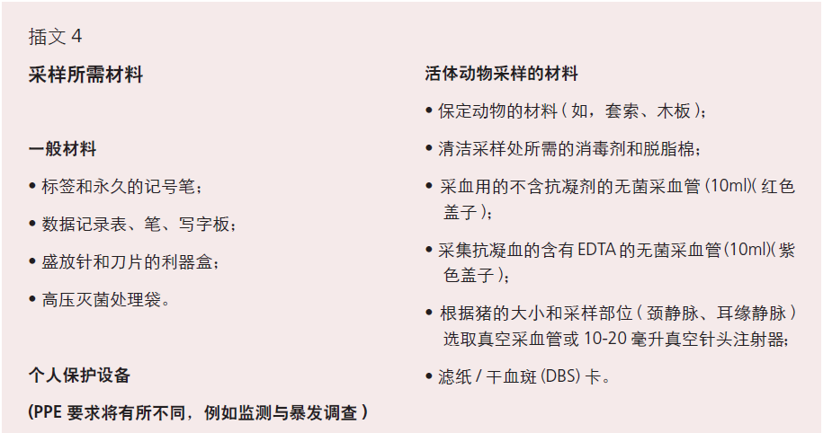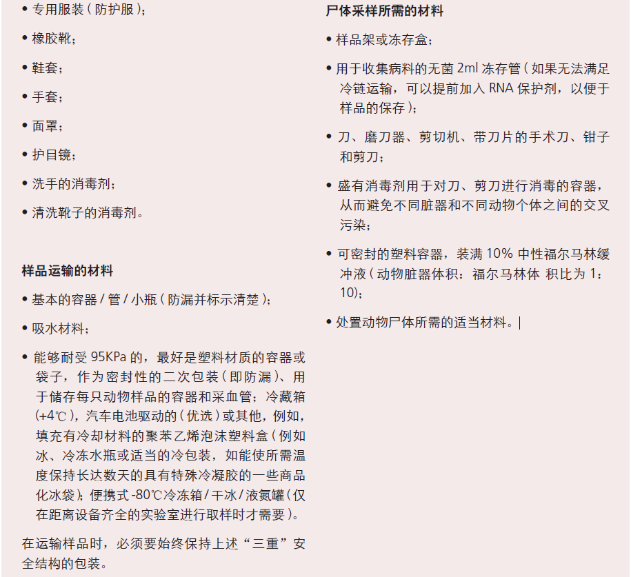 采樣小組應根據采樣動物的數量準備充足的采樣設備( 見插文4),并包含可能由于其他原因( 例如,失效的真空采血管) 而丟失或不可用的材料數量。另外,數據收集、個人防護/ 生物安全和樣品運輸的物品必須包裝( 參見插文4 中的“樣品運輸材料”)。