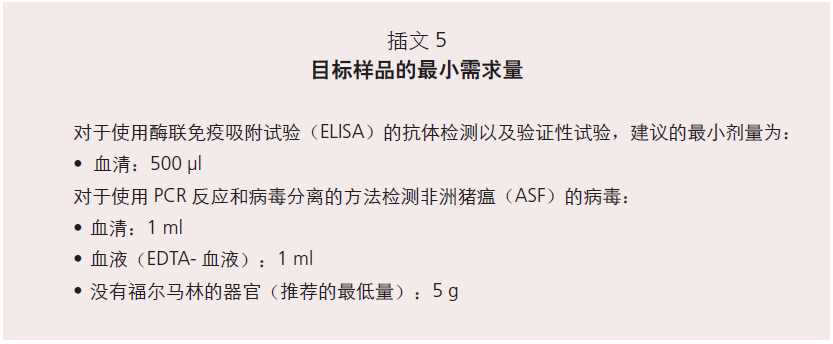ASF 的任何實驗室檢測都始于樣品采集。樣品采集過程中重要的考慮因素是調查的目的,例如診斷、監測或無疫認證。對哪些動物采樣將取決于抽樣的目的。例如,當調查疫情爆發( 被動監測) 時,應對針對患病和死亡動物,而在檢查動物是否暴露于病原( 主動監測) 時,應對年齡最大的動物進行抽樣。