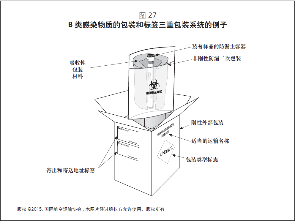 這些樣品應該按照規定3 運輸,并使用“三重包裝系統”。特別是如果樣品通過空運運輸,發貨人必須遵守國際航空運輸協會(IATA) 的《危險品條例(DGR)》,包裝應符合《危險品條例(DGR)》中的第6504 條包裝說明。