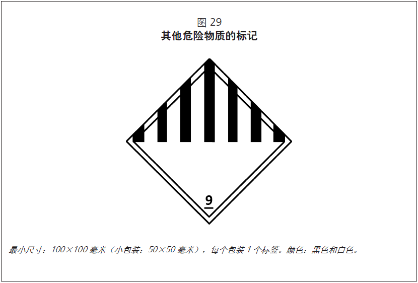 7. 聯合國(UN) 編號和帶有干冰的正確運輸名稱,后附有“作為冷卻劑”。干冰的凈數量(千克)必須清楚地寫在圖29 周圍,例如,UN1845、干冰、作為冷卻劑、凈重,## 千克。